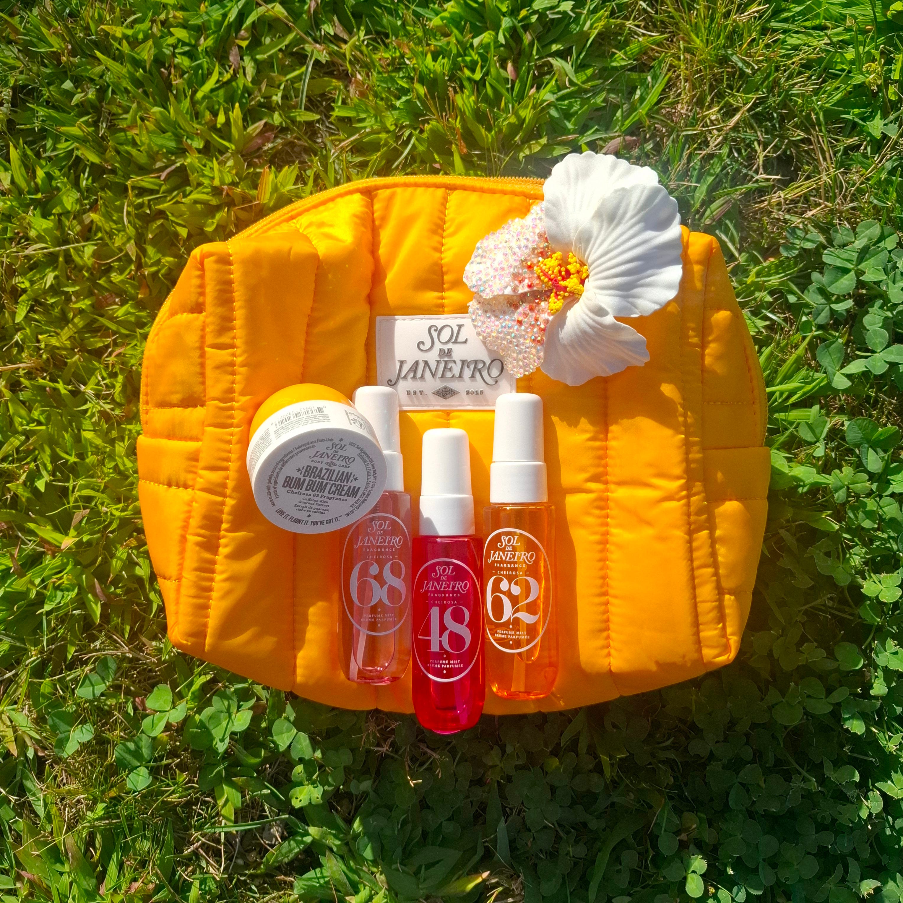 ME HE DADO UN CAPRICHO. Desde hacia semanas pasaba casi todos los días delante de una tienda Douglas. En el escaparate tenían expuesto unos perfume mists – brumas de perfume- deSol de Janeiro. Al final caí en las redes del consumismo y compré un pack de 3 brumas y la crema Brazilian Bum Bum en tamaño viaje + un neceser amarillo. Las brumas y sus aromas: